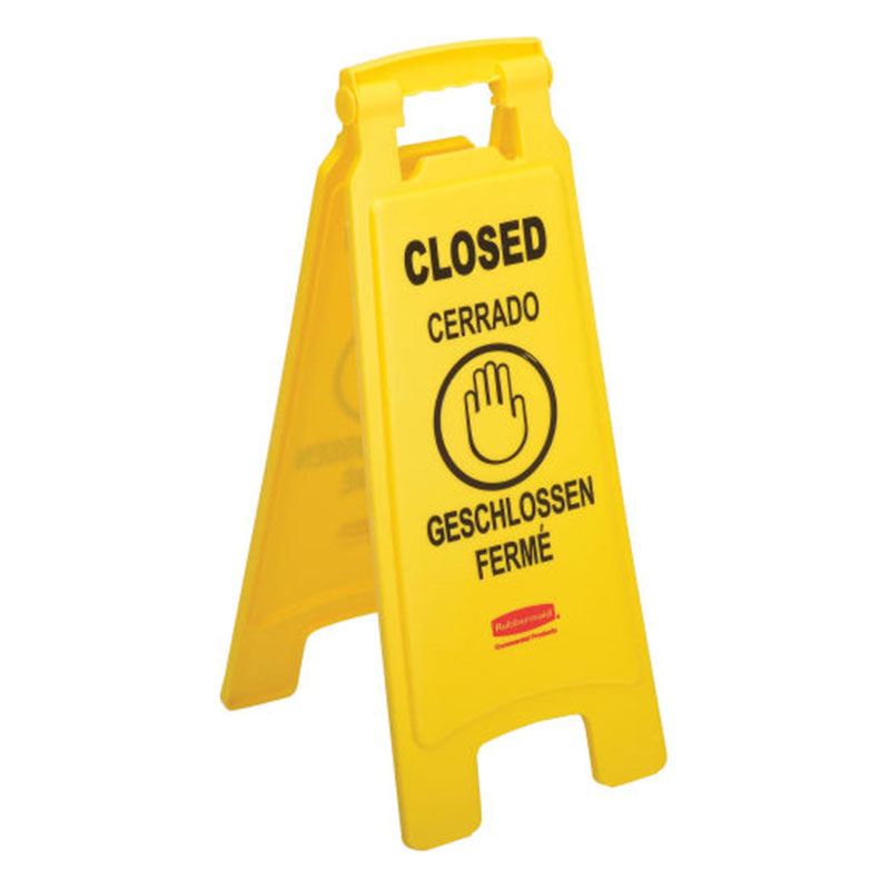 Folds flat for storage. Carrying handle. 25"H (open), 11"W x 1-1/2"D x 26-1/2"H (closed). This bright yellow "Closed" sign is printed in English, French, German and Spanish for maximum effective communication with a large audience.
