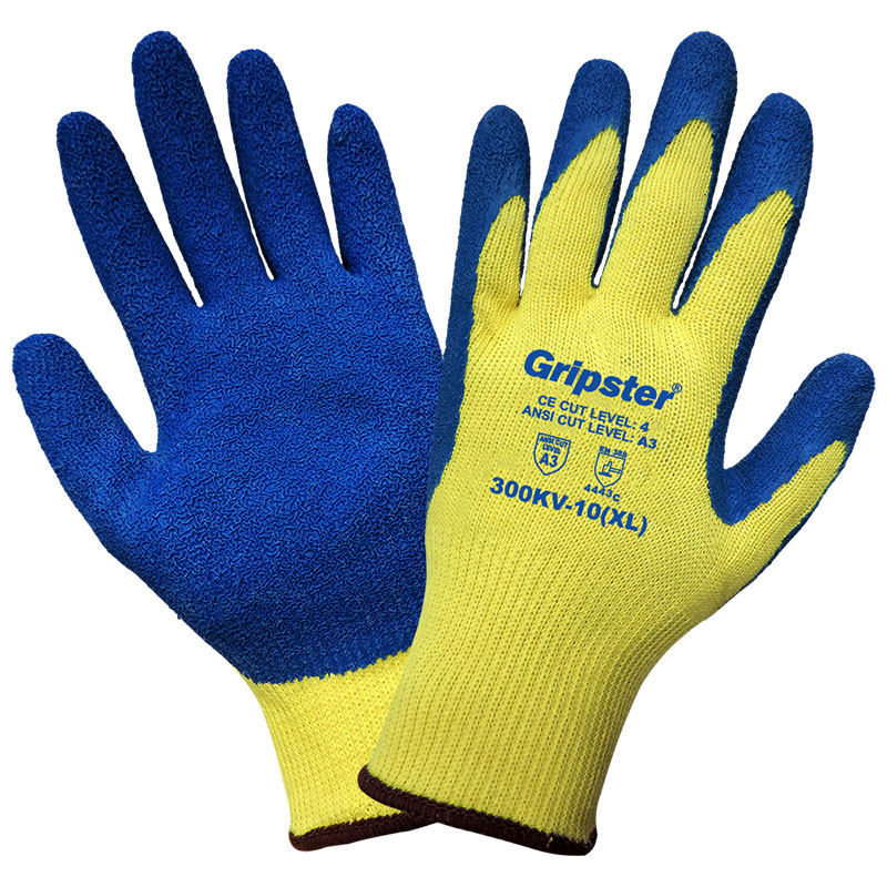 RUBBER COATED CUT RESISTANT GLOVES Gripster® - This seamless glove is a good dexterity cut resistant option that features a 10 gauge Kevlar® liner. The shell is enhanced by an etched rubber dipped palm. • ANSI level A3 cut resistance • EN 388 levels: 4443 • Puncture resistant etched rubber palm is good for wet or dry grip • Kevlar® shell offers both heat and cut resistance • Knit wrist cuff prevents gloves from slipping off while working
